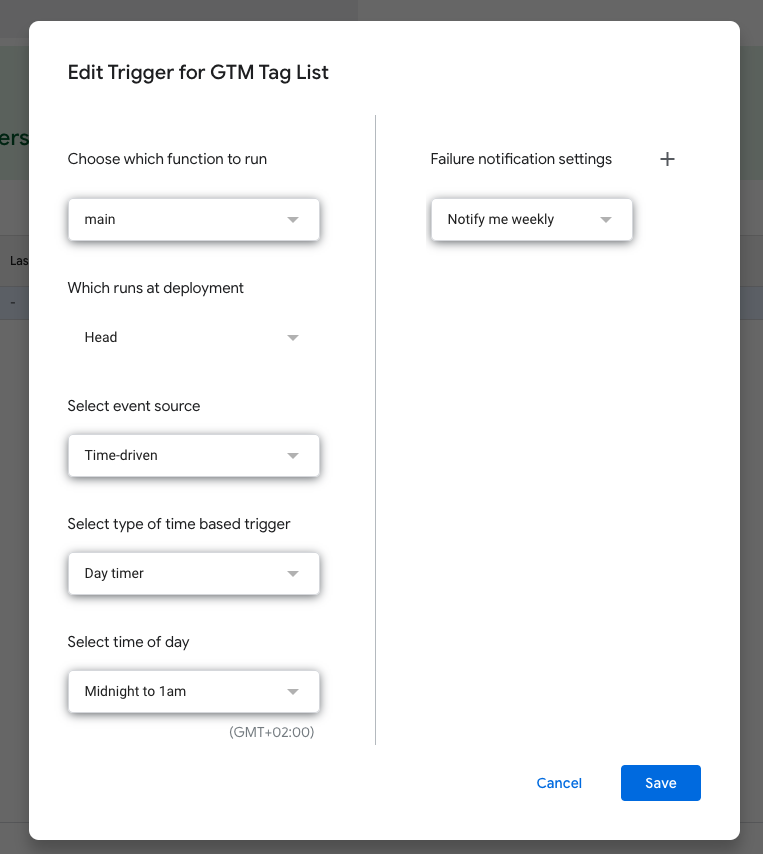 Next up we set up a trigger in our Apps Script project to fire every day (or more often if you change your tags that much). This way we’ll always have an up to date list.