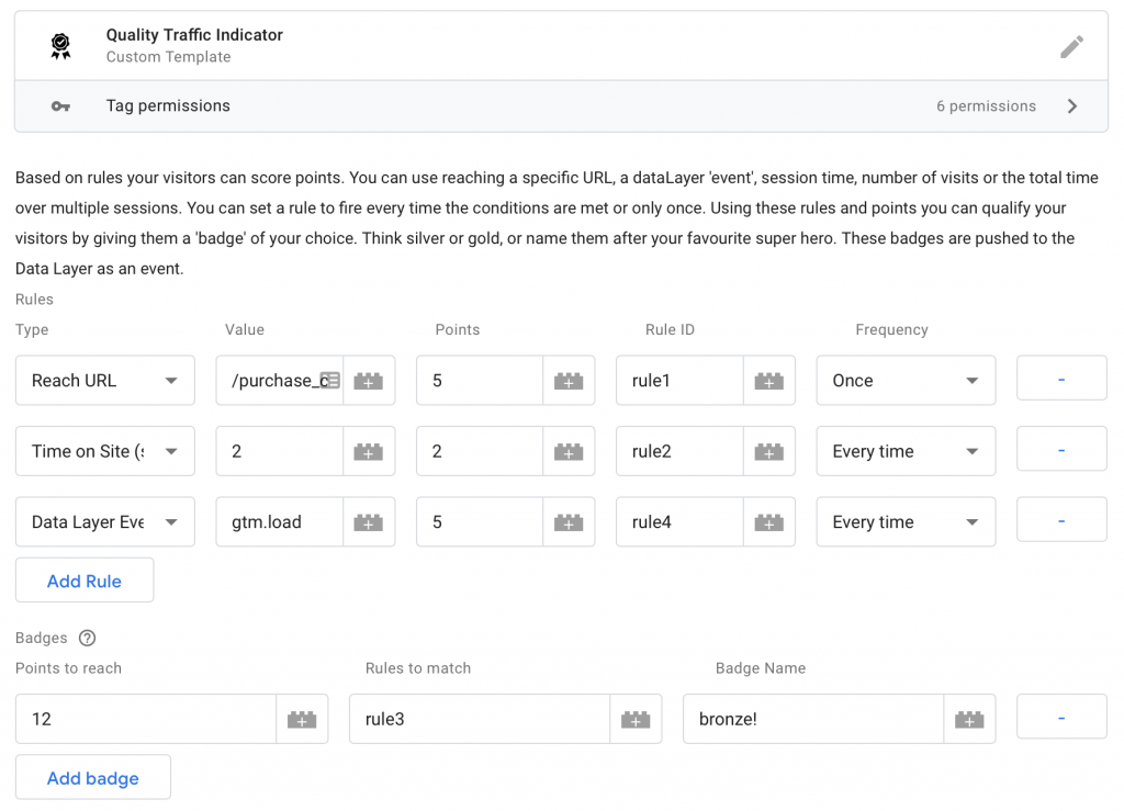 - A way to store and share those rules and badges —e.g. pushing an event to the data layer when a badge is received.