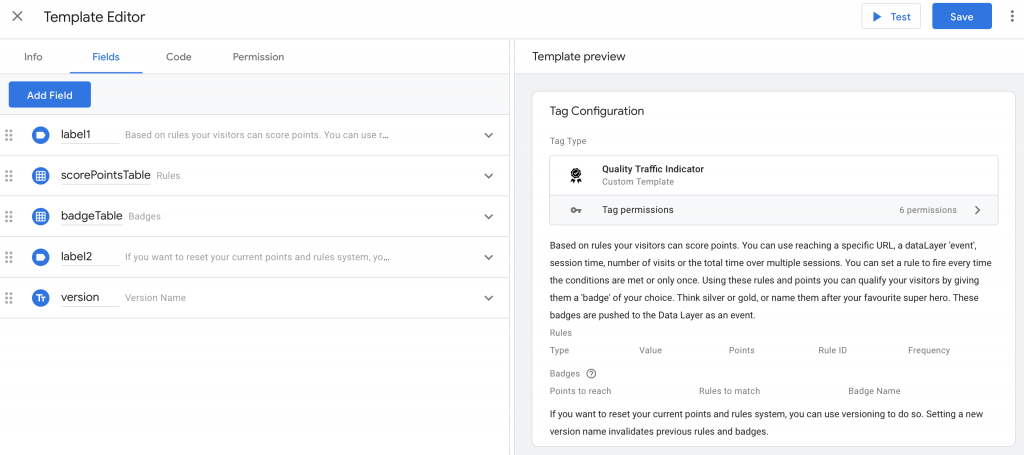 In the end I managed to make everything work like a charm. So let me take you through the actual template. The first part is setting up the fields you need. I decided on two main fields based on tables: one for rules and scoring points, on for badges that can be received. Rules are stored by a unique identifier which you can also use as a requirement for receiving a badge.